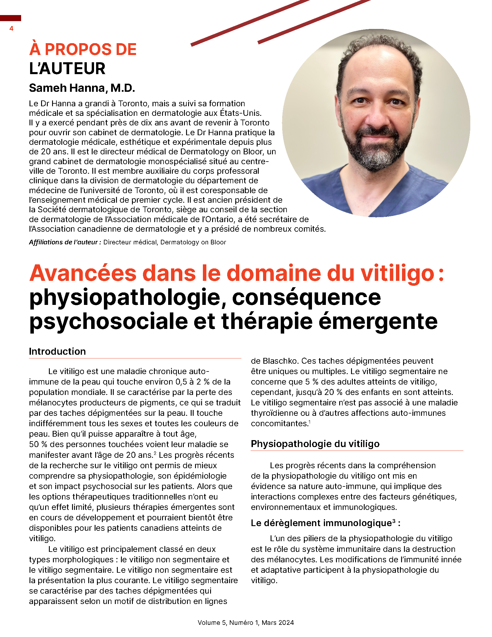 • Avancées dans le domaine du vitiligo : Physiopathologie, conséquence psychosociale et thérapie émergente